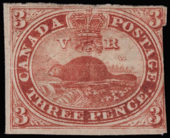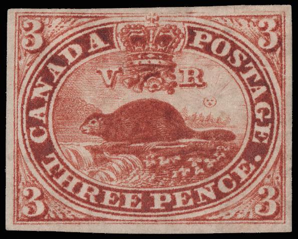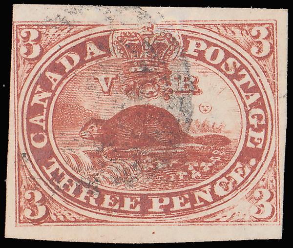 1852, Beaver, 3d red, on wove paper, imperforate, major re-entry (Scott 4 var.), position B53, the so-called "VR" re-entry, fresh and lightly canceled with ample to large margins, Very Fine, with a 1999 B.P.A. certificate. Unitrade C$450 ($330). Scott $200+. (Image)