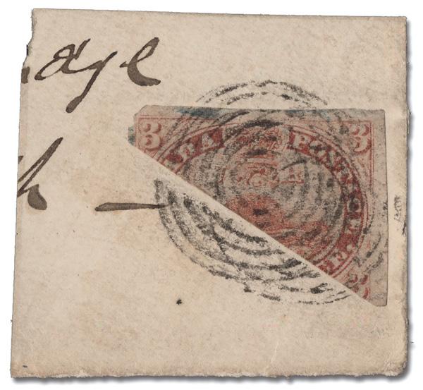 1852, Beaver, 3d red, on wove paper, imperforate, diagonal bisect (Scott 4b), upper right diagonal half tied on piece by 7-ring target cancels, Very Fine. Scott $35,000 for a cover.
