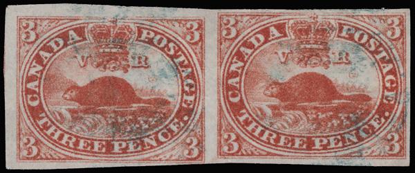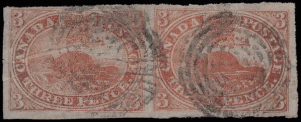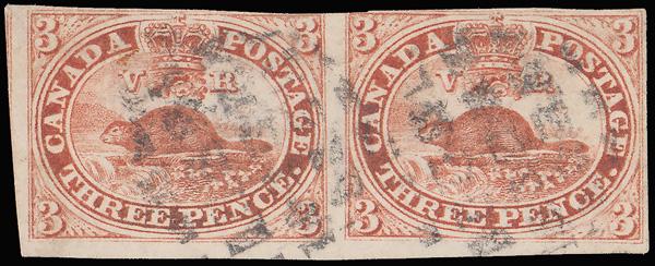 1852, Beaver, 3d red, on wove paper, imperforate (Scott 4 var.), horizontal pair, left stamp with a stitch watermark, 3+ margins, just touching at the top center, fresh color and neat dotted grid cancel, Fine. Unitrade 4x. Unitrade C$650 + for Fine singles ($480). (Image)