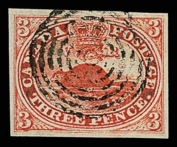 1852, Beaver, 3d red, on wove paper, imperforate, major re-entry (double transfer) (Unitrade 4xii), position 61, pane B, four-margined example, fresh and sound with bright color and target cancel; clear re-entries in lettering, frame, and lower left "3", Very Fine to Extremely Fine. Scott 4 var. Unitrade C$1,200 ($890). (Image)