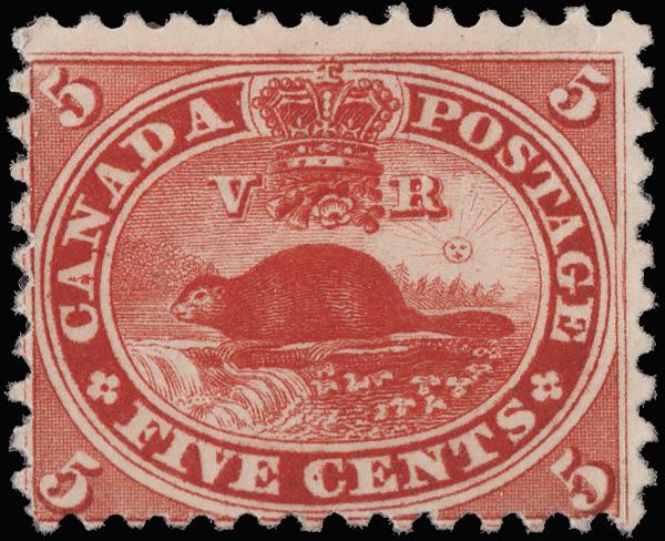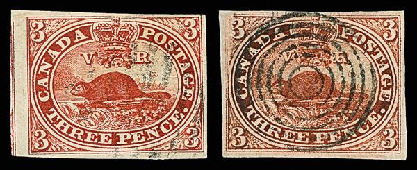1852, Beaver, 3d red, on wove paper, imperforate, group of five varieties (Scott 4 vars.), fresh and appealing, comprising #4 top margin single with part imprint, #4a var. on thick soft paper, #4iii, 4v (signed A. Brun), and #4 with strong re-entry; the last cut in at top right, the others grazed or four-margined, generally Fine. Unitrade C$1,700 ($1,260). (Image)