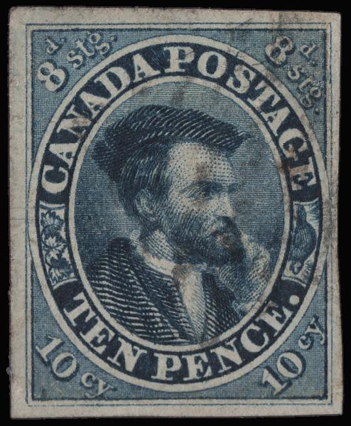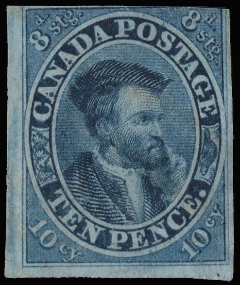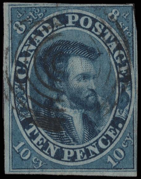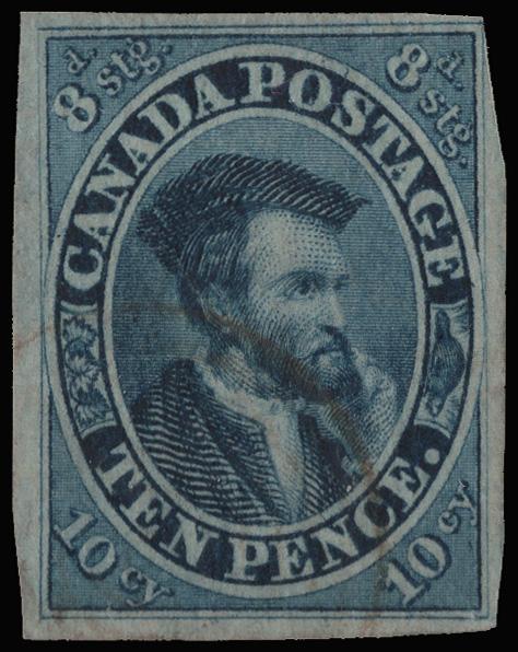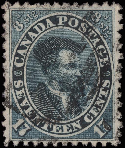 1859, Jacques Cartier, 17¢ prussian blue (Scott 19 var.), perf 12 x 11¾ exceptionally well centered with arely light Toronto grid cancel, Very Fine to Extremely Fine, with a 1996 C.P.E.S. certificate as perf 11¾. Unitrade 19i. Unitrade C$350 ($260). (Image)