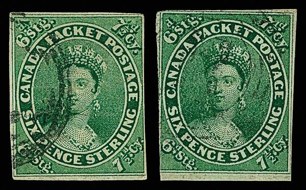 1852, Beaver, 3d red, on wove paper, imperforate, group of six varieties (Scott 4 vars.), fully identified, each four-margined and fresh, comprising Unitrade #4, 4 var. (short transfer upper left), 4c, 4ii, 4v, and 4xi, Very Fine, a lovely group, with 1992 Greene Foundation certificate for #4. Unitrade C$2,400+ ($1,780). (Image)