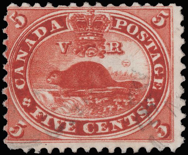 1852, Beaver, 3d orange red, on thin wove paper, major re-entry (Unitrade 4dvii), position A47, exceptionally fresh with nice margins except barely shaved outer frame line at the upper left, Montreal "21" 4-ring cancel, Fine to Very Fine. An example of this striking re-entry, with a 1987 Greene Foundation certificate. Scott 4d var.; $850. (Image)