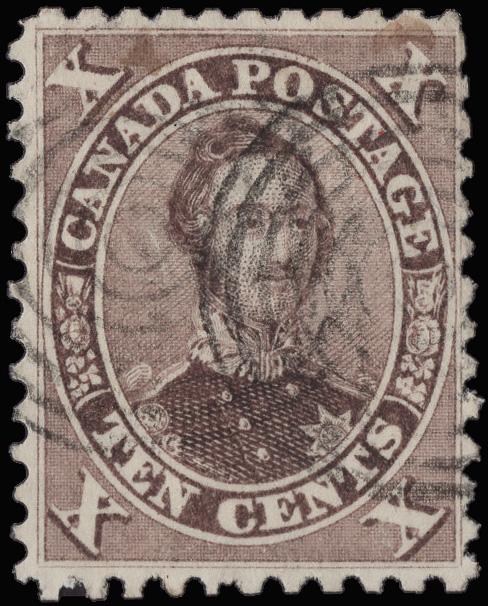 1859, Prince Albert, 10¢ brown, perf 12 x 11¾ "string of pearls" (Unitrade 17bvi), position 3; a fresh, nicely centered example with light target cancels, virtually Very Fine. Scott 17b var. Unitrade C$1,000 for VF ($740). (Image)