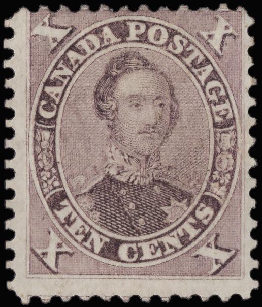 1859, Prince Albert, 10¢ red lilac, double epaulette (Unitrade 17v), position 61, o.g., small hinge remnant, fresh color; perfs into the design at the top, Very Good. A nice mint example of this rare double transfer. Scott 17; $2,000 for normal. Unitrade C$1,500 for VG ($1,110). (Image)