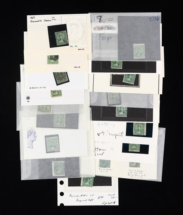 1859, Queen Victoria, 12½¢ yellow green, mint and used selection with varieties (Scott 18), A total of 21 examples (18 used, 3 unused) of the 12½¢ QV; colour varieties, four stamps showing imprint at margin (top, bottom, left & right), very thick paper (#18iii), a major re-entry (18iv), and one appearing to be imperforate (18b, unpriced used in Scott & Unitrade), overall Fine to Very Fine, photographed in full. (PDF2 for this Lot) (Image)