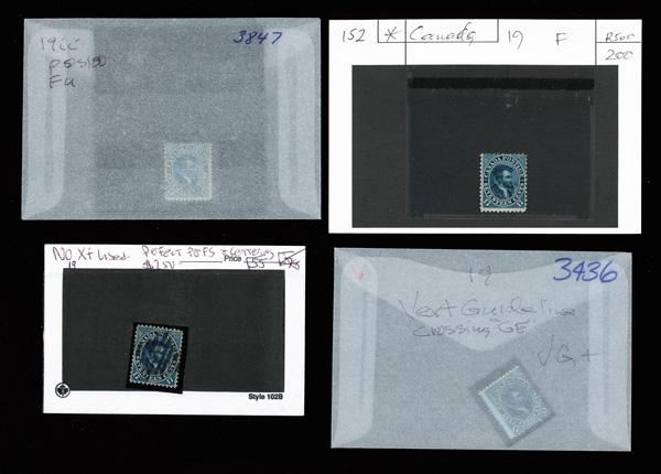 1859, Jacques Cartier, 17¢ blue, lovely quartet with varieties (Scott 19), Four examples, one unused, and three used, which include one magnificently centered, a major re-entry (#19ii), and one with visible guidelines through "GE" of postage & "TS" of cents, overall Fine to Very Fine, photographed in full. (Image)