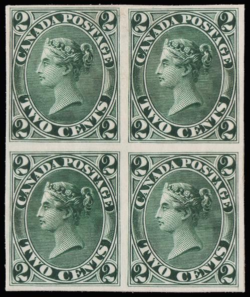 1864, Queen Victoria, 2¢ green, trial color plate proof on India on card (Scott 20TC), a choice block of 4, ample to large margins, Very Fine. Unitrade 20TC3. Unitrade C$1,600 as singles ($1,190). (Image)
