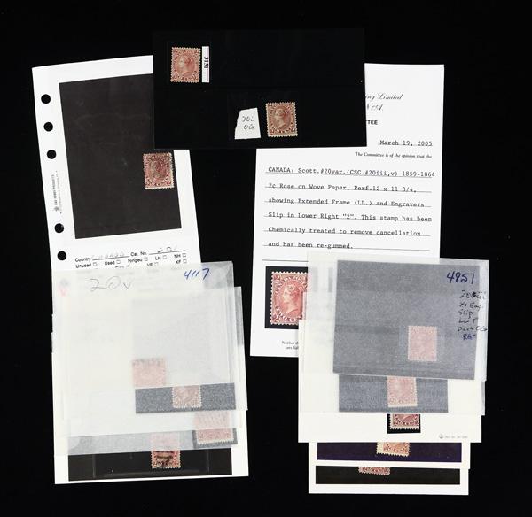 1864, Queen Victoria, 2¢ rose, selection of varieties (Scott 20 vars.), a lucky group of 13 comprising 3 mint, 1 unused, and 9 used (one with cancel removed and regummed; Unitrade #20iii, v; 2005 CPES certificate), most all identified by Unitrade number; offering shades, engraver's slips, wing margin, captured imprint, dated cancel, etc.; some lovely colors present, all attractively printed; the occasional fault, but useful and salable material, generally Fine to Very Fine, fully imaged online. Scott $6,950 for normals. (PDF for this Lot) (Image)