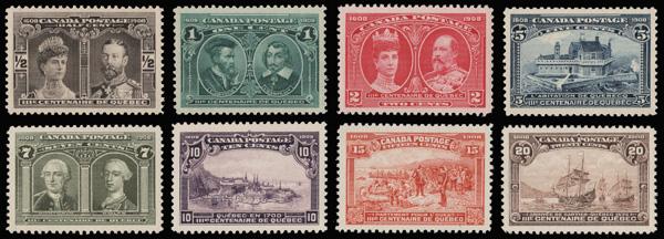 1908, Quebec Tercentenary complete (Scott 96-103), a selected mint set, o.g., never hinged, all post office fresh and and incredibly well centered, Extremely Fine and choice. Rarely offered as a set in this quality. Unitrade C$4,605 ($3,420). Scott $2,665. (Image)