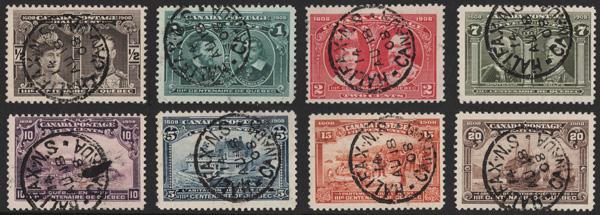 1908, Quebec Tercentenary complete (Scott 96-103), a unique used set, all with matching, "socked-on-the-nose" Halifax, N.S. c.d.s.s, Aug 18, 1908, bright, fresh and Fine to Very Fine. Scott $709. (Image)