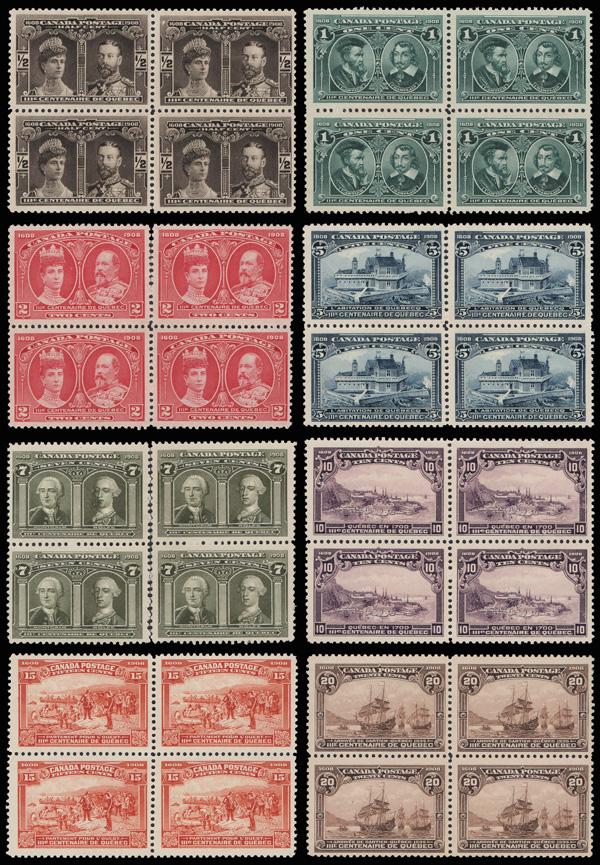 1908, Quebec Tercentenary complete (Scott 96-103), an unused set of blocks of 4 without gum, bright, fresh and quite well centered; some separation (the 7¢ is two vertical pairs), otherwise Fine to Very Fine. Scott $3,912 a o.g. singles. (Image)