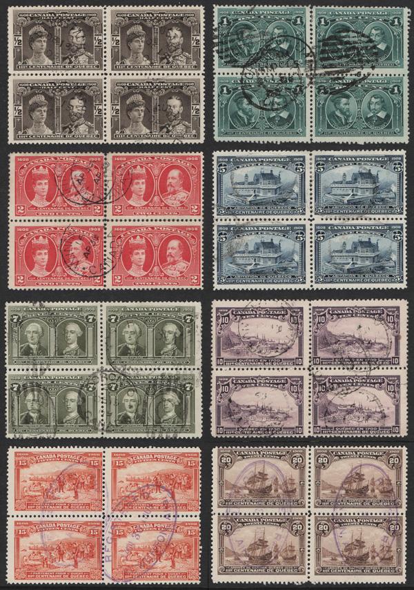 1908, Quebec Tercentenary complete (Scott 96-103), a fresh set of used blocks of 4, Fine. Rarely seen in used blocks. Scott $2,835 as singles. (Image)