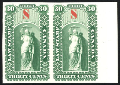 1864 5c Law Stamp with "L.C." Overprint Plate Proof Essay in Blue, a horizontal pair on card-mounted India paper with sheet margin at right, very fine. This value was not issued in Lower Canada. (Image)