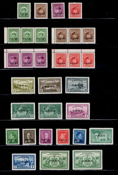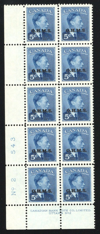 1950 5c Blue King George VI Official with O.H.M.S. Overprint, Missing Period After S, a mint vertical plate 2 block of 10, upper left stamp lightly hinged, the rest, including the variety are never hinged. Unitrade does not give a value for such a plate block (they do for the 4c) but the single variety stamp catalogues $150. (Image)
