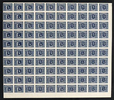 1942 16c Bright Ultramarine Airmail Special Delivery, a mint never hinged full sheet of 50, with plate 1 inscription at upper right and lower right, folded between rows 5 and 6 (with separation between two stamps along the fold), very fine. (Image)