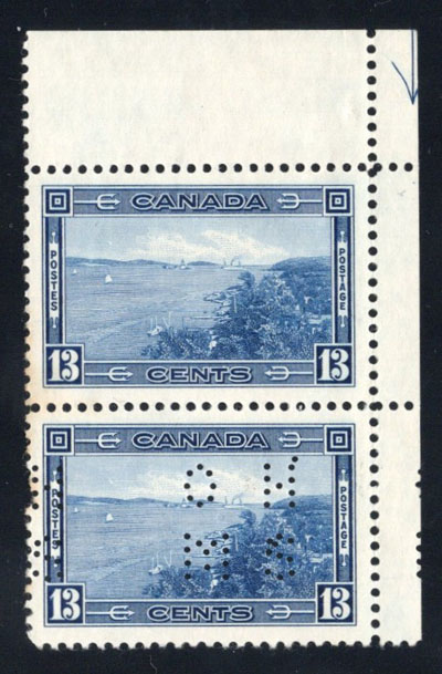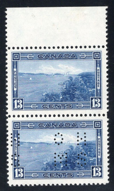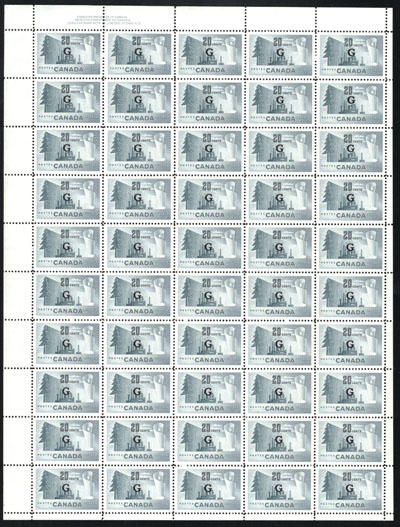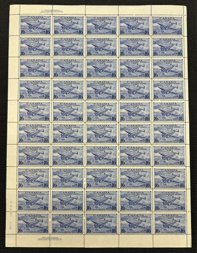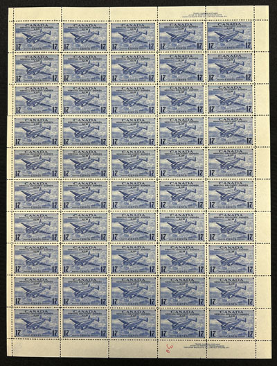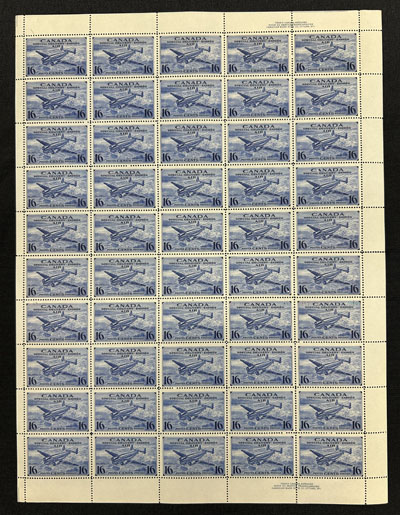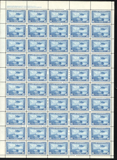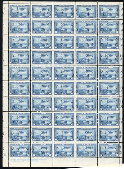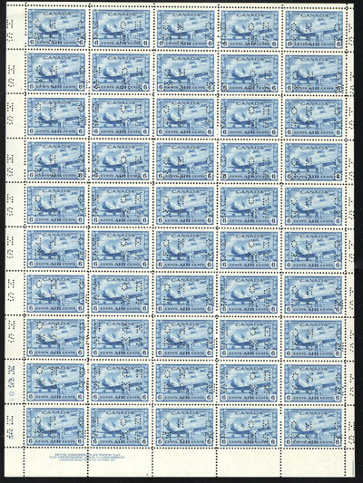 1942 6c Blue R.C.A.F. Training Plane Official, Perforated O.H.M.S., a mint never hinged full sheet of 50, with plate 1 inscription at lower left, folded once horizontally, fresh, very fine and quite scarce. No premium has been added for the plate block (footnote says "plate blocks exist. Value is 50% of the sum of value for singles in the block", which would be $7,500 in this case). (Image)