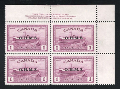 1950 $1 Red Violet Train Ferry Official with O.H.M.S. Overprint, an upper right plate block of four, the stamps are mint never hinged, there is a hinge in the margin only, fresh and fine-very fine. (Image)