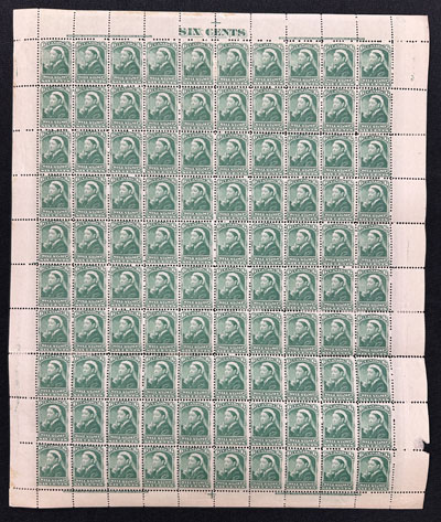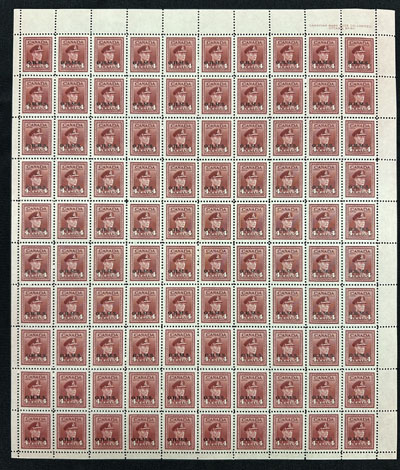 1932 6c on 5c Ottawa Conference Surcharge Airmail, a mint never hinged full sheet of 50, with sheet margins on two sides and straight edges on two others (as they all are), fresh, with no evidence of folding, overall fine and scarce. (Image)