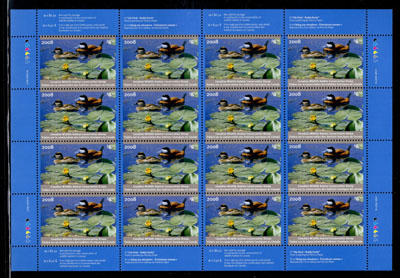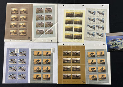 1967 Turquoise City of Winnipeg Wildlife Conservation Stamp, a bulk lot of 6 full sheets of 100, each showing the mixed perforation varieties in rows 3, 6 and 9, without gum (as issued). Catalogued as 30 vertical strips of 3 with different perfs (MW1c) plus 10 regular stamps (x6 sheets). Very fine. (Image)