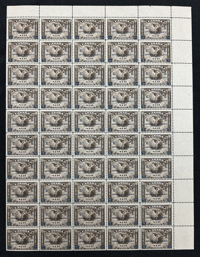 1935 6c Red Brown Airmail, a complete lower left pane of 50, with plate 1 inscription at lower left and "AIR" variety in position 10 (Unitrade C5iv), fresh and very fine. (Image)