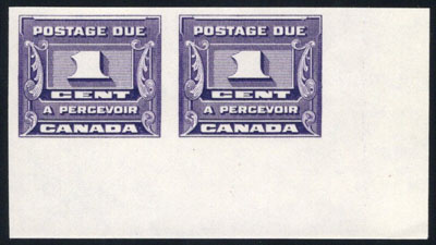1934 1c Dark Violet Postage Due Imperforate, a mint never hinged horizontal pair, from the lower right corner of the sheet, very fine. Rare, as only two LR corner pairs can exist (Image)