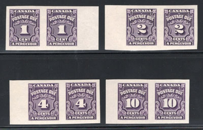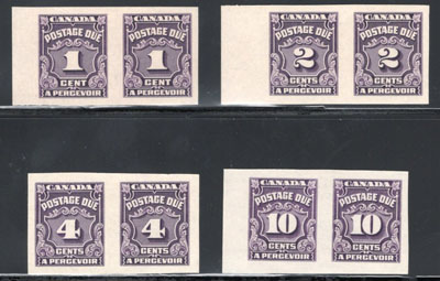 1935 1c, 2c, 4c and 10c Dark Violet Postage Due Imperforates, a complete set, as these were the only values issued imperforate, all four values in a mint lightly hinged horizontal pair, three have sheet margins at left, very fine. (Image)