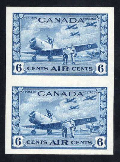 1942 6c Deep Blue Airmail Imperforate, a mint never hinged vertical pair, with two tiny natural paper inclusions, very fine. A rare and undervalued imperforate, as only 50 pairs were issued. (Image)