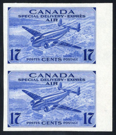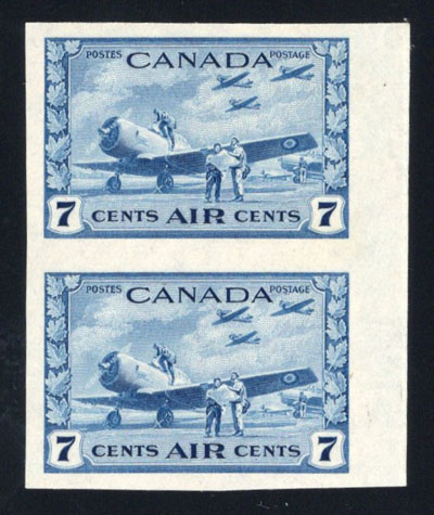 1943 7c Deep Blue Airmail Imperforate, a mint never hinged vertical pair with sheet margin at right, showing a light fingerprint on the gum, mentioned for strict accuracy, very fine. A rare and undervalued imperforate, as only 50 pairs were issued. (Image)
