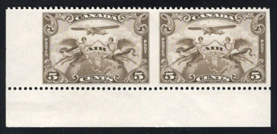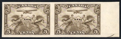 1928 5c Brown Olive Airmail Imperforate, a mint never hinged horizontal pair, with sheet margin and cutting arrow at right, making it a rare lower right corner pair, very fine. (Image)