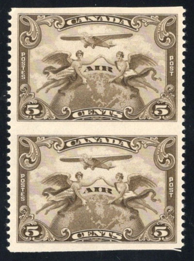 1928 5c Brown Olive Airmail, Imperforate Horizontally, a mint never hinged vertical pair, very fine. (Image)