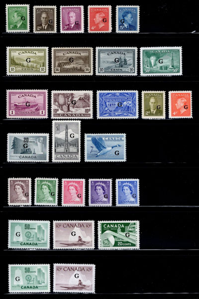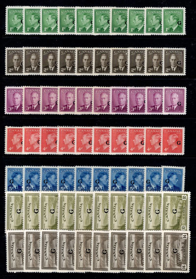 Stock of Mint Never Hinged Officials with "G" Overprint, all issues are present, except for O23, O25, O27, and all values are represented by 10 very fine mint never hinged singles, except O28, O39 and O45 which have 20 stamps each. A useful lot for dealers, unchecked by us for blunt Gs, Flying Gs, etc. (Image)