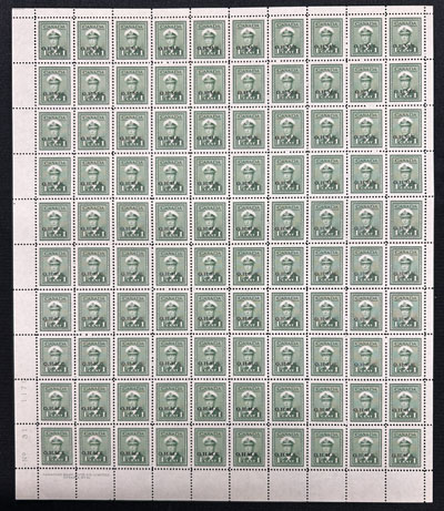 1938 6c Blue Steamer and Monoplane Official, Perforated O.H.M.S., a mint never hinged full sheet of 50, with plate 1 inscription at lower left, fresh with no evidence of having been folded, very fine and scarce. No premium has been added for the plate block (footnote says "plate blocks exist. Value is 50% of the sum of value for singles in the block", which would be $600 in this case). (Image)