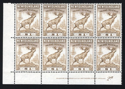 1966 $1 Brown Caribou Inland Revenue, a mint lower left corner block of 8, showing the complete plate inscription (plate 2a) in the lower margin. Hinged on one stamp at top and very lightly hinged in the lower margin, fresh and very fine. (Image)