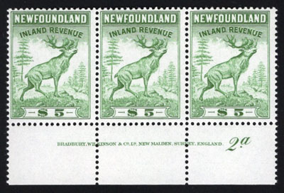 1942 $5 Green Caribou Inland Revenue, a mint never hinged lower sheet margin strip of three, showing the complete plate inscription (plate 2a) in the lower margin, fresh and very fine. (Image)