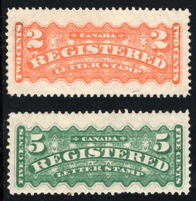 1880s-1890s 2c and 5c Registration Stamps, the 2c orange value is never hinged but has a small spot of missing gum, and the 5c green is hinged with a small corner crease. Both stamps are fresh and attractively centered. (Image)