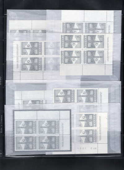 1953 $1 Grey Totem Pole Official, Overprinted G, a plate 1 and plate 2 matched set of four corner plate blocks of four, mint never hinged and very fine. (Image)