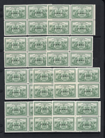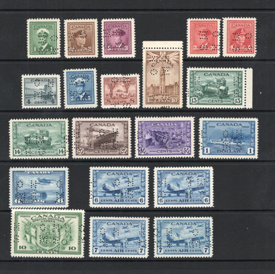 Group of 20 Different Perforated 4-Hole O.H.M.S. Officials, all mint, includes the 14 War issues, plus the 10c Special Delivery and 5 different Airmail issues (including an inverted 6c R.C.A.F. Training Plane and what appears to be the two different O.H.M.S. perforations on the 7c R.C.A.F. Training Plane). The top three values of the War set are hinged, rest is never hinged and the centering is overall very fine. Unchecked by us as to whether these are O9 or O10 types. (Image)