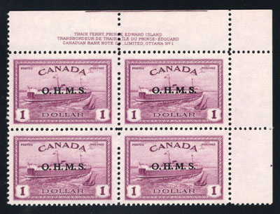 1950 $1 Red Violet Train Ferry Official, with O.H.M.S. Overprint, a mint never hinged upper right corner plate block of four, very fine. (Image)