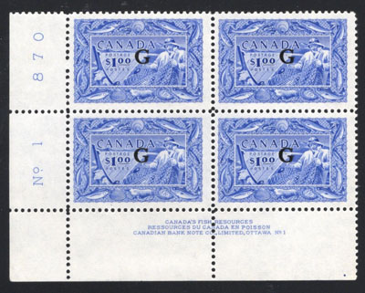 1950 $1 Blue Fisherman Official with G Overprint, a mint never hinged lower left corner plate block of four, very fine. (Image)
