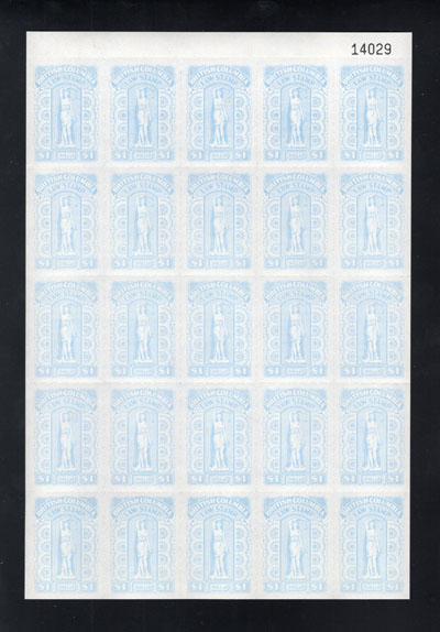 1981 $1 Blue Law Stamp from the 13th Series, a complete pane of 25, with sheet number in top margin, mint never hinged and very fine. (Image)