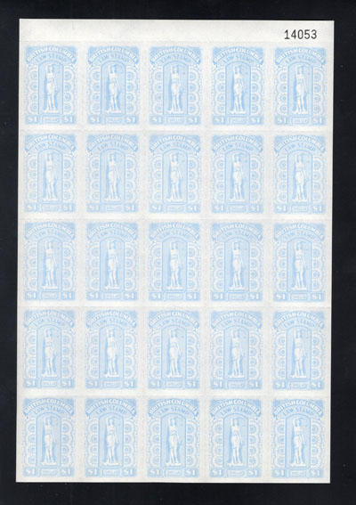 Group of 9 Different British Columbia Law Stamp Sheets, with BCL #s 23 (with three van Dam-listed plate scratches BCL23d), 38, 51, 52, 55, 57 (position 16 has the "flaw above C of COLUMBIA" variety BCL57a), 58 (position 3 has the "horizontal bar joining 2 and 0 at right" variety, BCL58a), 60 and 63 (cataloguing $6,250 by itself), each in a mint never hinged sheet of 25, all but two with plate number in top selvedge. A very fine group. (Image)