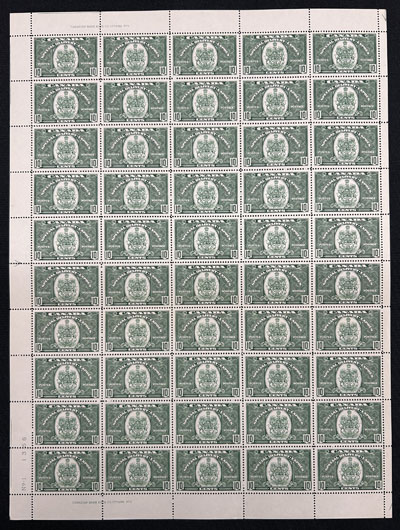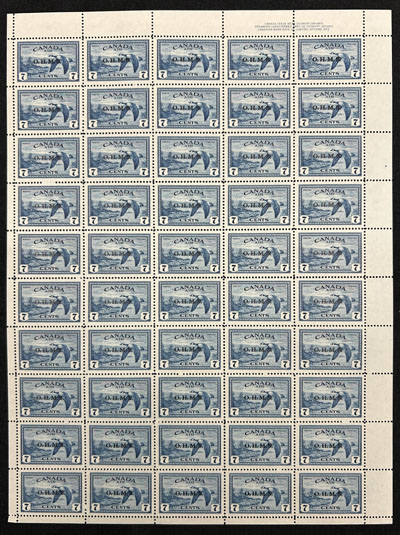 1946 7c Blue Canada Goose Official, Overprinted O.H.M.S., a complete mint never hinged sheet of 50, with plate 1 inscription at upper right, fresh with no evidence of having been previously folded, very fine. (Image)
