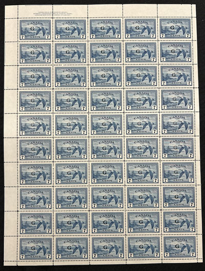 1950 7c Blue Canada Goose Official, Overprinted G, a complete mint never hinged sheet of 50, with plate 1 inscription at upper left, fresh with no evidence of having been previously folded, very fine. (Image)