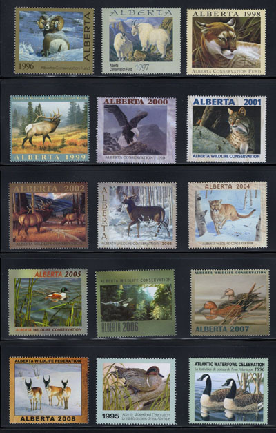 Complete Set of Provincial Wildlife Conservation Stamps, 1992-2008, (missing only Québec) for a total of 174 different stamps, each in a mint never hinged single (no booklet). All neatly displayed on 12 black stock sheets, also includes all 4 of the issued gutter pairs. A very fine collection, we do not recall such a complete set ever being offered before, all pages scanned online. (Image)