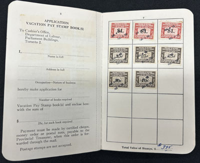 Complete Government of Ontario Vacation Pay Booklet, for the period of 1953-1954, this one filled-out on August 3, 1953. Contains van Dam $180 worth of Vacation stamps (OV7 x5 and OV10 x3). Very fine, and scarce. (Image)