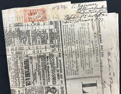 1877 Complete Newspaper with 10c Québec Law Stamp Used as Evidence in a Court Case, the "Le National" (Montréal) dated SEP.13.1877 has a QL15 10c Law stamp affixed, tied by manuscript notes in French explaining that this was used in a Superior Court case "Gauthier vs. Dagenais" as "Exhibit No 2" evidence. A rare usage, and the first we have seen - a must have for the serious Revenue collector. Accompanied by a (French) description of the court case. (Image)