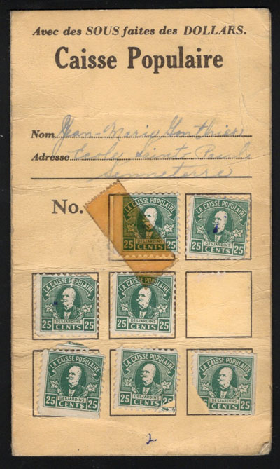 Complete Caisse Populaire Savings Booklet, with 4 pages filled with 49 "Caisse Populaire" savings stamps of Québec (5c, 10c and 25c values). The used stamps alone have a van Dam catalogue value of $1,406. A few stamps held by tape and there are other faults, still a scarce to rare document, only the second we recall seeing. (Image)