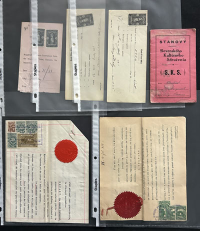Group of Over 35 Interesting Documents with Provincial and Federal Revenue Stamps, a diverse group including Federal: three Electric Meter documents (with FE11 and FEG 9-11), a document with FWM39, 55 and 59, 6 documents with FX7, 10, 18, 36, 42, 62, 66, 71, 80 and 89. Also Provincial documents from Ontario, with 14 Land Titles (1918-1928) each with a 20c or 30c Law stamp, 6 other Land Titles (1931-1933) with 20c or 30c Law stamps, and Québec with 5 court documents (1897-1946), each with a variety of Registration stamps. Last but not least is a membership booklet (1936-1937) from the Slovak Cultural Association in Montréal with Slovak "contribution" stamps. See pictures for an overview. (Image)